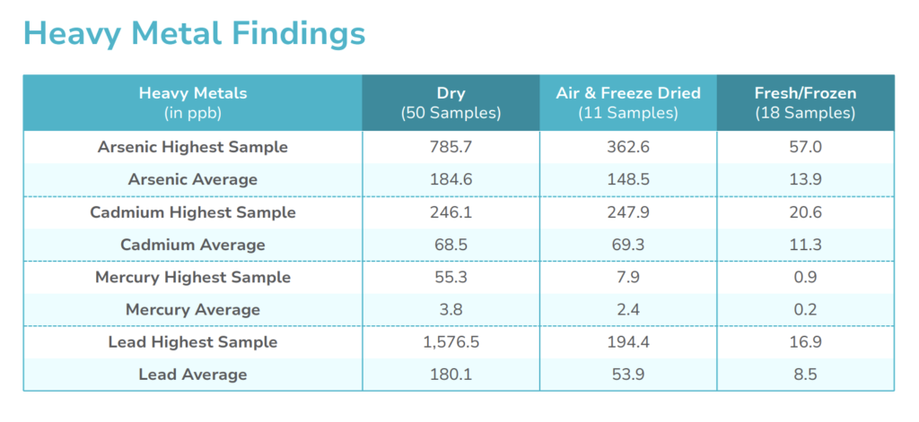 While the report included a list of brands tested, the organization did not identify which specific products had the highest contaminant levels. It also addressed differences in portion sizes between food types, stating that serving-size adjustments did not materially change the results and that dry food still tested significantly higher in heavy metals.